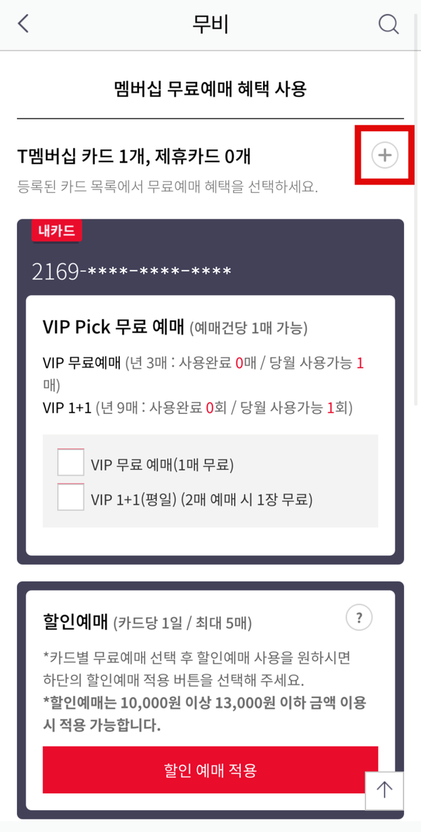혜택 사용 단계에서 등록된 자신의 카드를 체크한 후 아래의 ‘적용’을 클릭합니다.